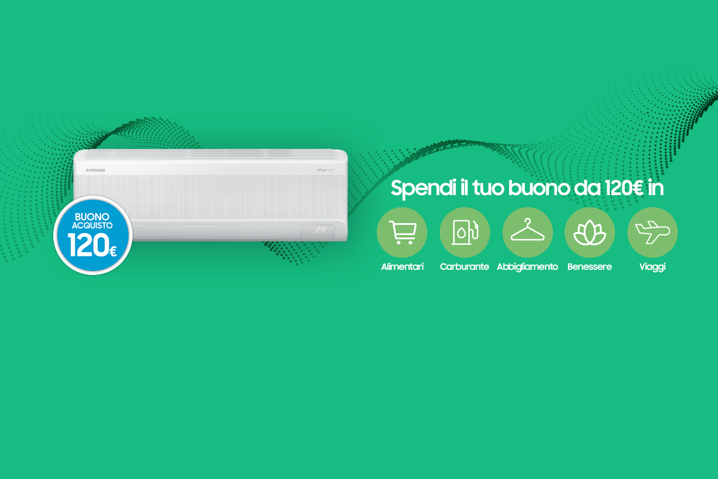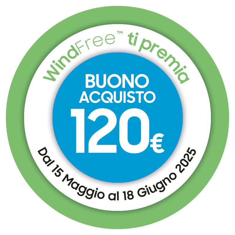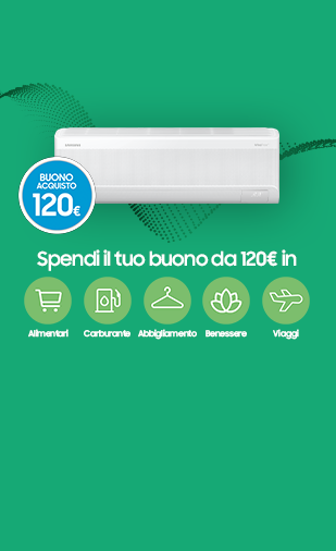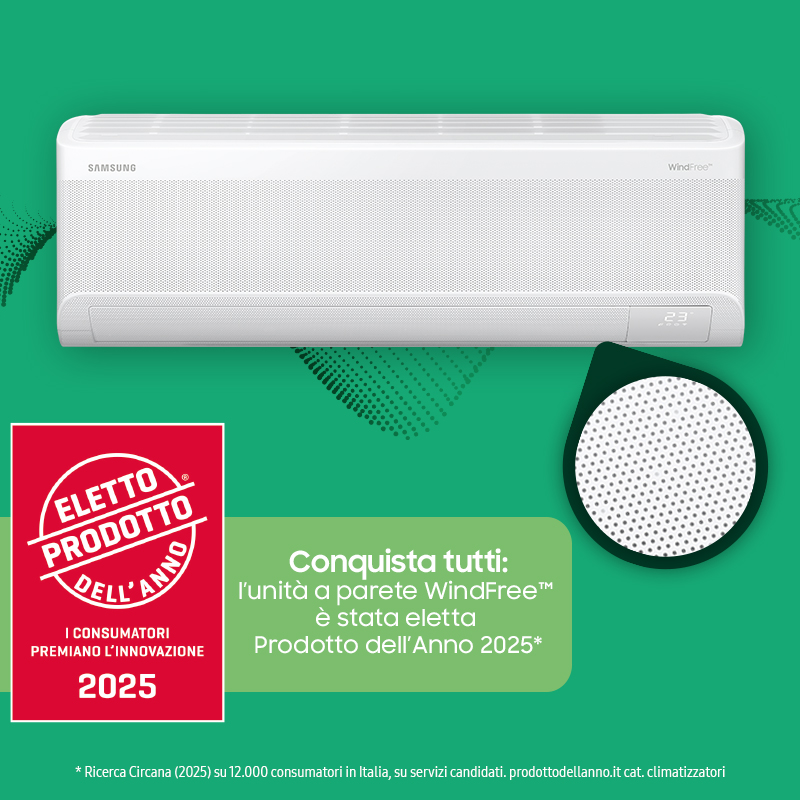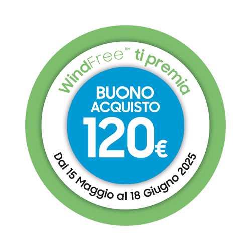 Operazione a premio promossa da Samsung Electronics Air Conditioner Europe B.V. riservata ai consumatori ai sensi del D. Lgs. 6 settembre 2005, n. 206, residenti nella UE. Prodotti Promozionati: set “Monosplit WindFree™” (composto dalla combinazione di n. 1 unità esterna + n. 1 unità interna) (di seguito il “Set Monosplit”) e set “Multisplit WindFree™” (composto dalla combinazione di n. 1 unità esterna + almeno 2 unità interne) (di seguito il “Set Multisplit”) a marchio Samsung, specifi catamente indicati nell’Allegato 2 del Regolamento. Periodo di acquisto: dal 15 Maggio al 18 Giugno 2025. Registrazione dell’acquisto entro l’8 Luglio 2025 su www.samsungwindfreetipremia.com. Punti vendita aderenti: punti vendita in Italia e nella Repubblica di San Marino, che esporranno il materiale promo pubblicitario relativo all’Operazione ed e-store elencati nell’Allegato 1 del Regolamento. Premio: un buono di acquisto del valore di € 120 IVA inclusa. Il buono è spendibile su www.windfreetipremia.idea-shopping.it (la “Piattaforma”), anche in più soluzioni, entro e non oltre sei mesi dalla ricezione. Decorso il predetto termine il valore residuo del buono sarà azzerato senza rimborso. Ciascun partecipante potrà prendere parte all’Operazione per non più di 1 volta. Operazione NON cumulabile con altre iniziative promozionali (vendite abbinate e/o manifestazioni a premio) promosse sugli stessi Prodotti Promozionati da Samsung Electronics Air Conditioner Europe B.V. durante il periodo di svolgimento dell’Operazione. Regolamento completo su www.samsung.it/windfreetipremia