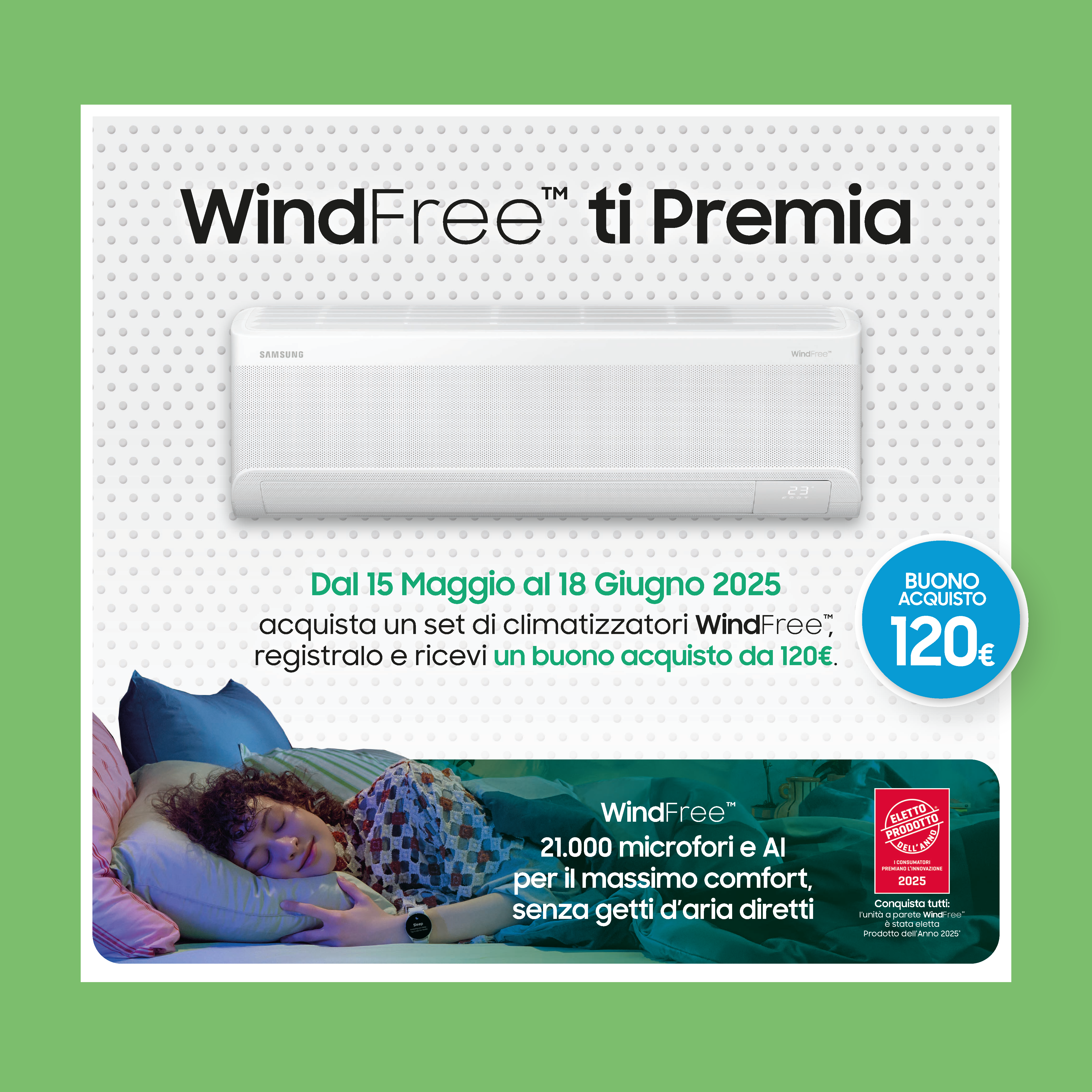 L’innovativa tecnologia WindFree™ di Samsung rende la climatizzazione di ogni ambiente ancora più confortevole: il classico getto d’aria diretto si trasforma, attraverso migliaia di microfori, in una piacevole brezza diffusa, creando un ambiente “aria ferma”¹ , per garantire il massimo benessere in ufficio come a casa, sia di giorno che durante la notte, anche nelle situazioni più delicate come in camera da letto o in presenza di bambini.