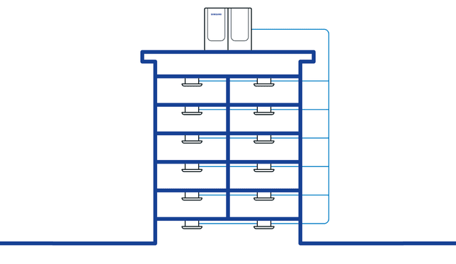 ¹ HVM aušintuvo šaldymo skysčio kiekis yra iki 65 % mažesnis nei tradicinėse VRF sistemose. Palyginti su „Samsung DVM S“ 60 AG, turinčiu R410A šaldymo skystį, prijungtu prie dvylikos 14 kW vidaus įrenginių ir 100 metrų vamzdžių. ² HVM aušintuvų lauko įrenginių SEER (vardinis vėsinimas) yra 5,7, o SCOP (vardinis šildymas) – 4,3. Išbandyta pagal AG042 modelį bandymo sąlygomis: Vanduo 35 be siurblio įvado. Rezultatai gali skirtis priklausomai nuo aplinkos veiksnių ir individualaus naudojimo ypatybių. ³ Esant mažai apkrovai, skirtingi lauko įrenginiai įjungiami pakaitomis. Esant vidutinei apkrovai, lauko įrenginiai veikia daline apkrova, kad būtų optimizuotas efektyvumas. Esant maksimaliai apkrovai, visų lauko įrenginių kompresoriai veikia maksimaliu pajėgumu.