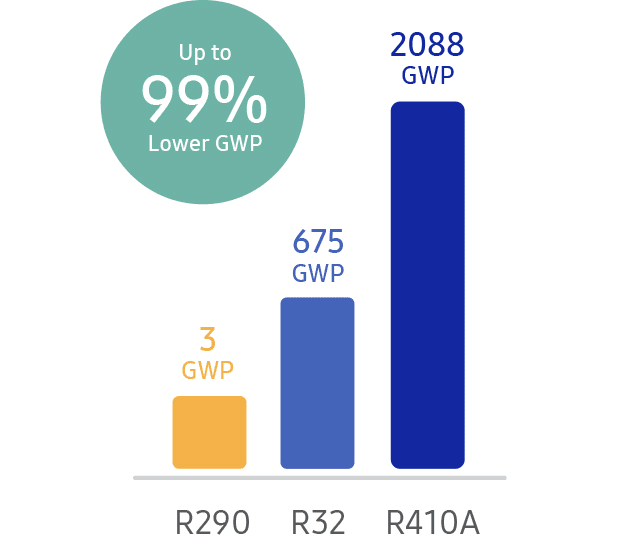 R290 (3) ima niži potencijal globalnog zagrevanja (GWP) od uobičajenih rashladnih sredstava R32 (675) i R410A (2088). To je do 99% niži GWP. Šta znači smanjeni GWP? Ima manji potencijal da zadrži toplotu u atmosferi, čime se smanjuje svoj doprinos globalnom zagrevanju.